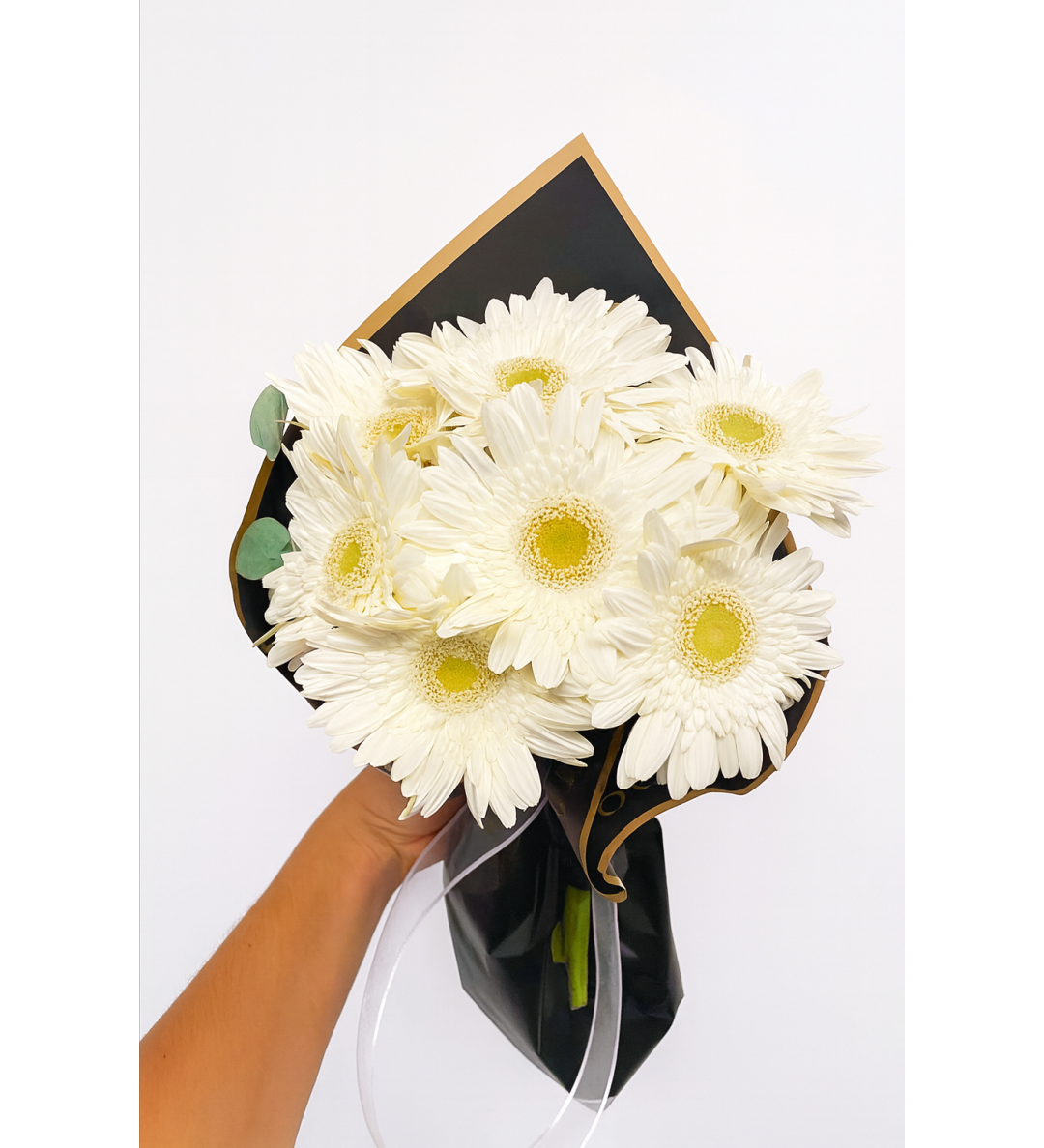 Saflığın ve zarafetin sembolü olan beyaz gerberalar, siyah buket kâğıdı ve beyaz kurdele detayıyla modern bir şekilde sunuluyor. Ortalama 40-50 cm uzunluğunda hazırlanan bu özel buket, sade ama etkileyici görünümüyle sevdiklerinize unutulmaz bir sürpriz yapar.