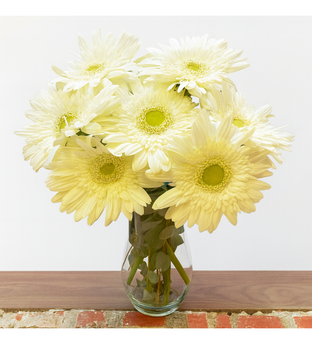 • Ürün İçeriÄŸi: 7 adet beyaz gerbera, okaliptüs yaprakları, cam silindir vazo