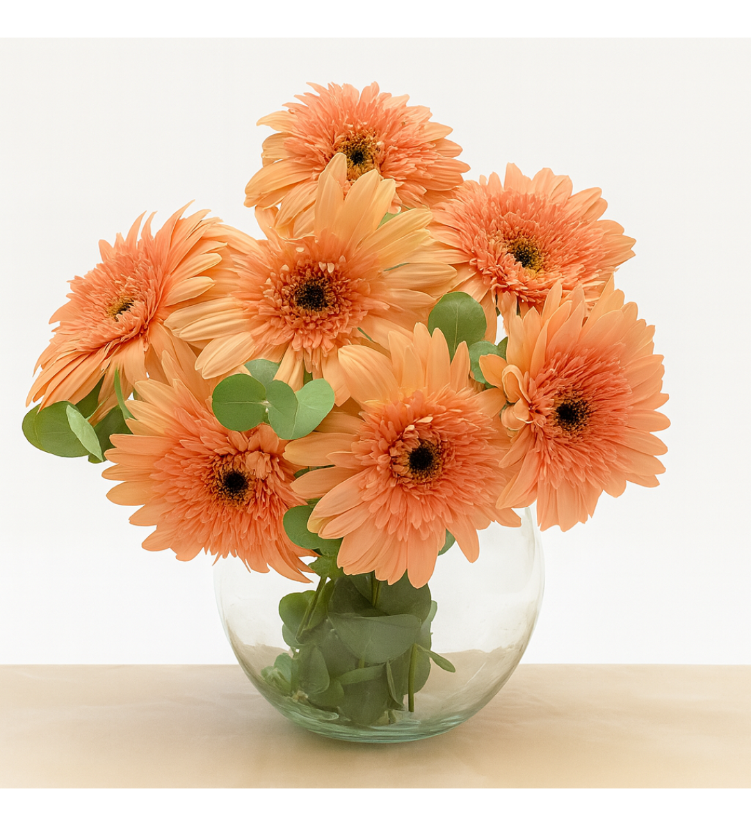 Romantik ve zarif görünümüyle dikkat çeken 7 adet pembe gerbera, cam akvaryum vazo içinde modern bir tasarımla sunuluyor. Ortalama 35-45 cm uzunluğunda hazırlanan bu özel aranjman, okaliptüs yapraklarıyla zenginleştirilerek ferah bir görünüm kazandırılmıştır.