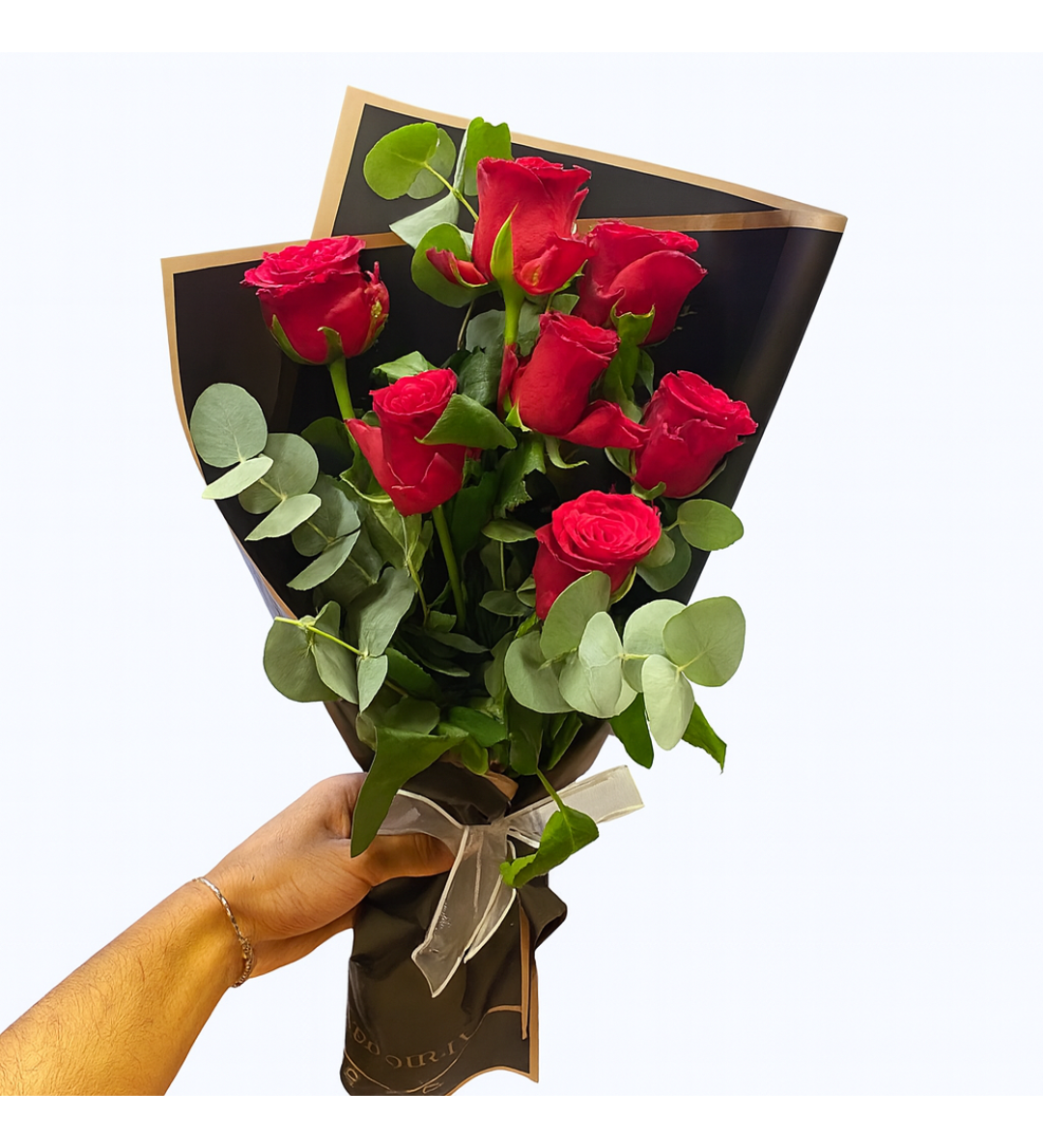 Ürün İçeriği: 7 adet kırmızı gül, siyah buket kâğıdı, beyaz kurdele, okaliptüs yaprakları
