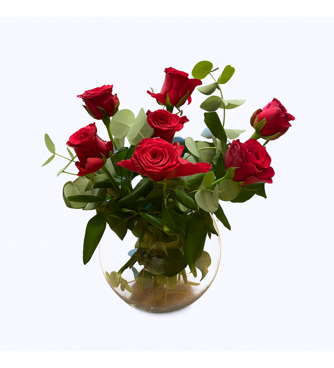 Aşkın ve tutkunun simgesi olan 7 adet kırmızı gül, cam akvaryum vazo içinde modern bir tasarımla hazırlanmıştır. Ortalama 35-45 cm uzunluğunda, okaliptüs yapraklarıyla zenginleştirilmiş bu aranjman, sevdiklerinize şık ve unutulmaz bir hediye sunar.