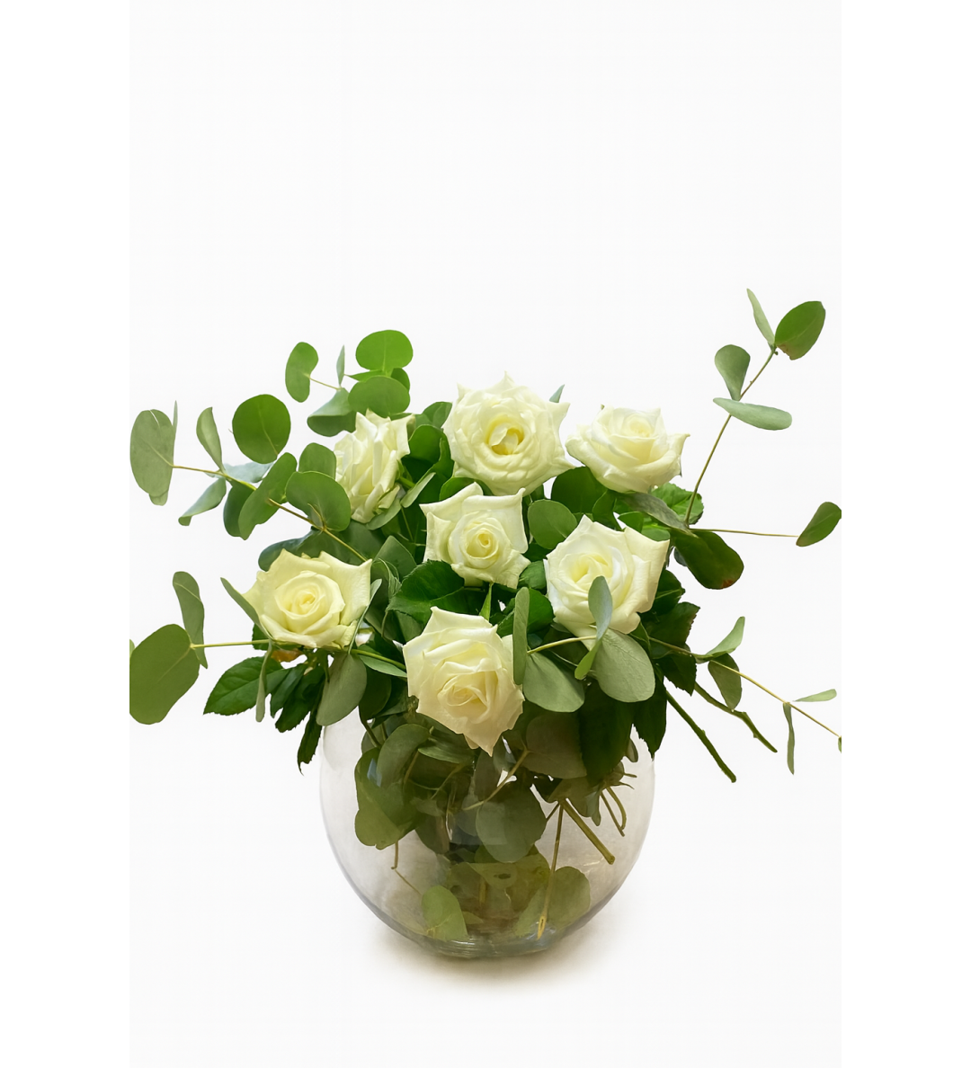 Saflığı ve zarafeti simgeleyen 7 adet beyaz gül, şık akvaryum cam vazo içerisinde düzenlenmiştir. Ortalama 30-40 cm uzunluğunda, okaliptüs yapraklarıyla zenginleştirilen bu aranjman, sade şıklığıyla her ortama uyum sağlar.