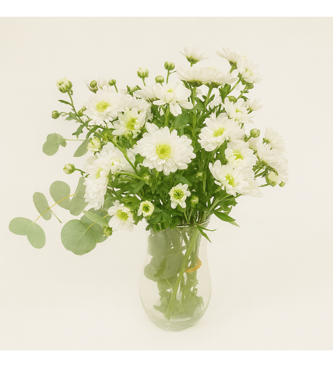 Ürün İçeriği: Beyaz krizantem dalları, okaliptüs yaprakları, cam silindir vazo