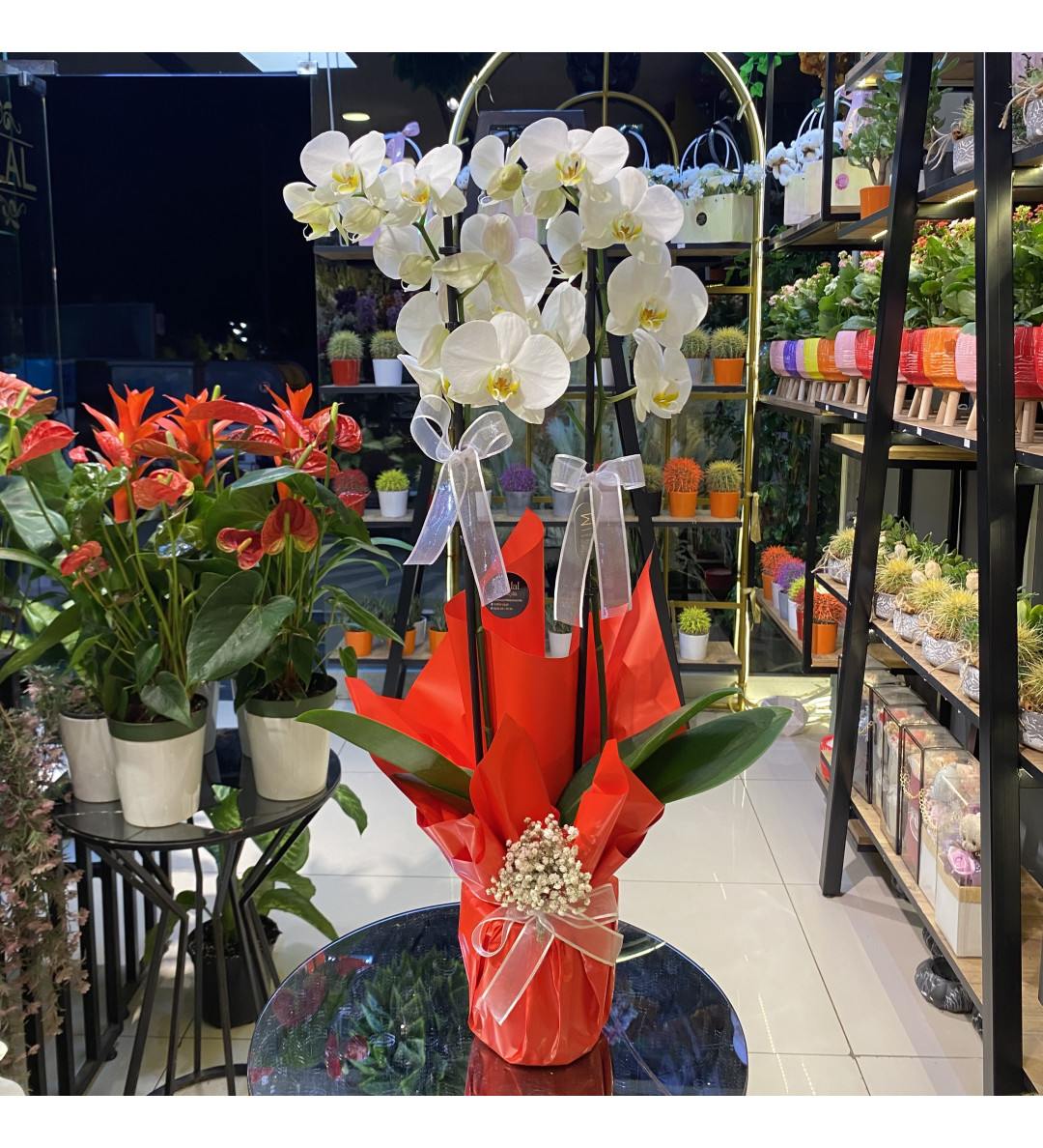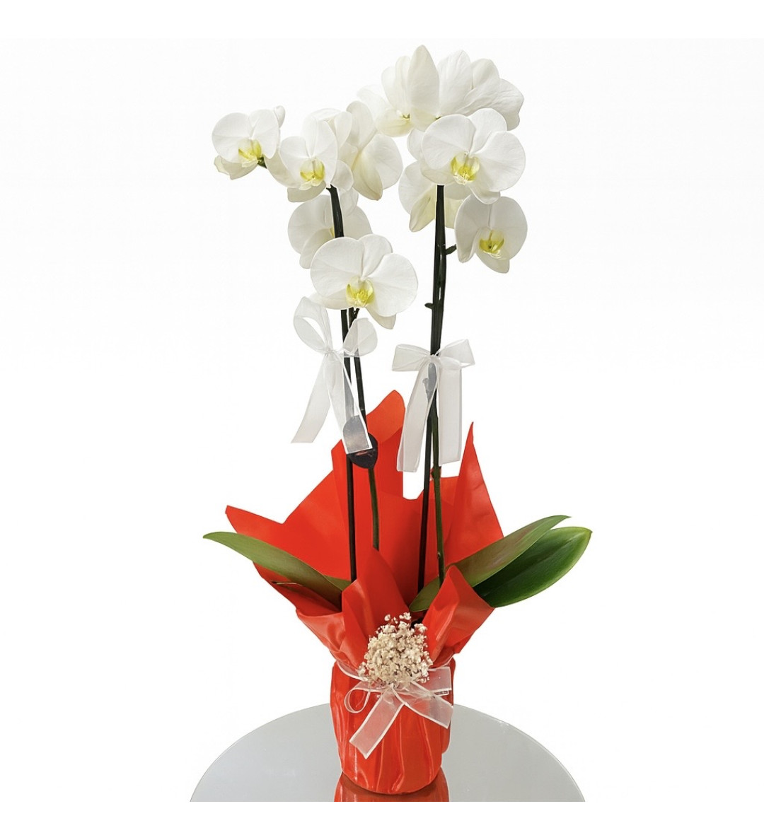 Zarafetin ve asaletin sembolü beyaz orkide, çift dallı formuyla sevdiklerinize uzun ömürlü bir mutluluk armağan eder. Kırmızı buket kâğıdıyla özenle sarılan bu şık orkide, hem ev hem de ofis dekorasyonuna uyum sağlayarak bulunduğu her ortama prestij katar. Sevdiklerinize anlamlı ve özel bir sürpriz için mükemmel bir tercih.