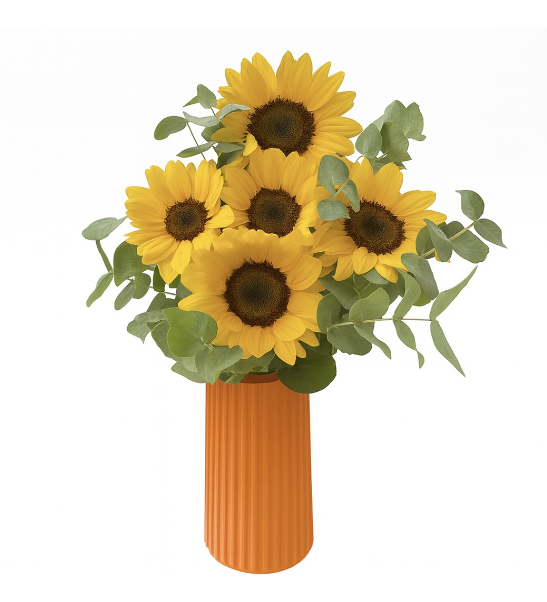 Güneşin sıcak enerjisini evinize taşıyan 5 adet ayçiçeği, turuncu plastik vazo içinde özenle hazırlanmıştır. Canlı rengi ve pozitif enerjisiyle bulunduğu ortama mutluluk katan bu özel aranjman, sevdiklerinize neşeli bir sürpriz yapmak için ideal bir seçimdir.