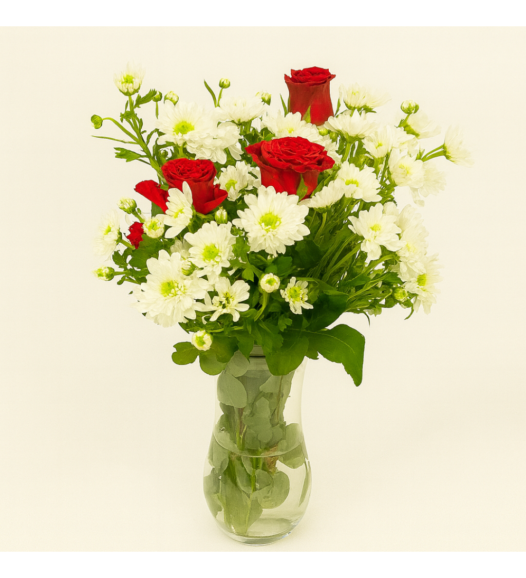 Romantizmin simgesi kırmızı güller ile saflığın temsilcisi beyaz krizantemlerin uyumundan oluşan bu özel aranjman, şeffaf cam silindir vazo içinde şık bir sunumla hazırlanmıştır. Ortalama 40-50 cm uzunluğunda, zarif ve modern bir görünüm sunar.