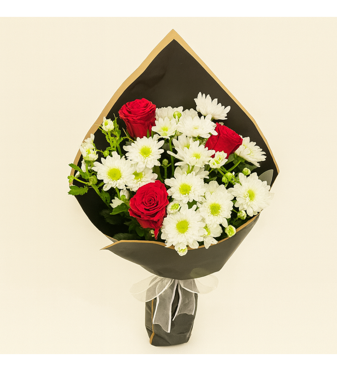 Romantizmin kırmızı güllerle, saflığın beyaz krizantemlerle buluştuğu özel buket. Ortalama 40-50 cm uzunluğunda hazırlanan bu şık aranjman, siyah buket kâğıdı ve beyaz kurdele detayıyla zarif bir görünüm kazanır.