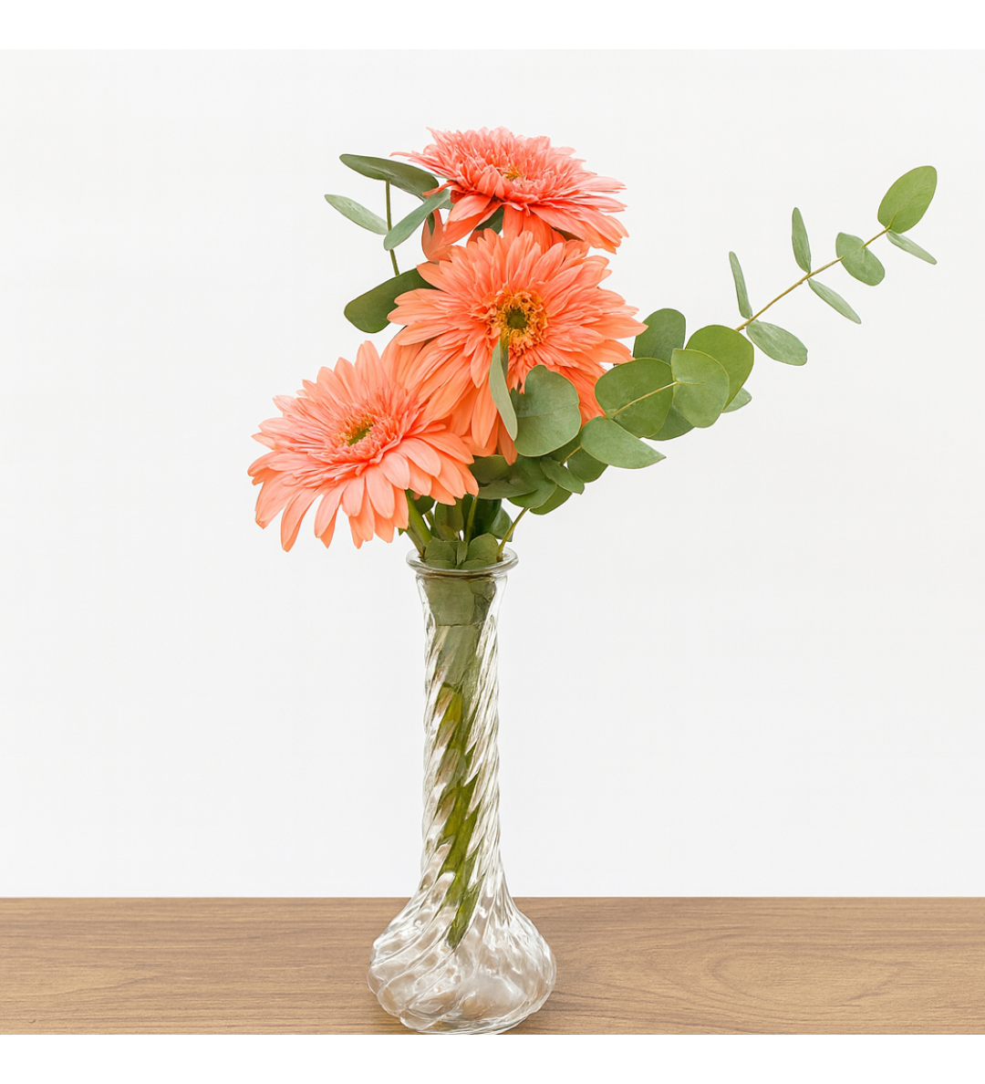 Ürün İçeriği: 3 adet pembe gerbera, okaliptüs yaprakları, ince cam vazo
