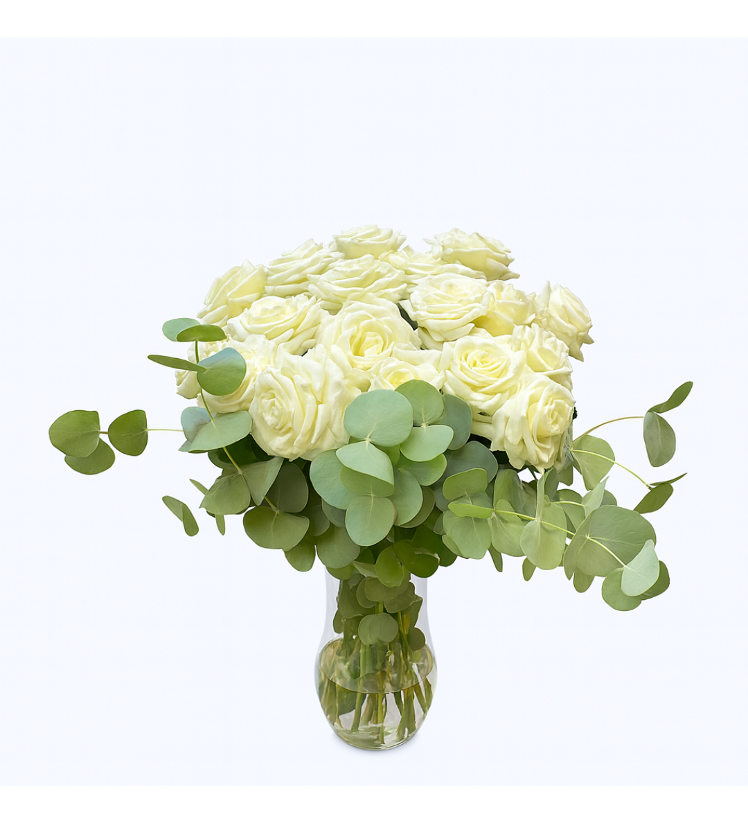 Saflığı ve zarafeti temsil eden 20 adet beyaz gül, cam silindir vazo içerisinde şık bir şekilde düzenlenmiştir. Ortalama 45-55 cm uzunluğunda, okaliptüs yapraklarıyla zenginleştirilen bu özel aranjman, bulunduğu ortama ferahlık ve huzur katar.