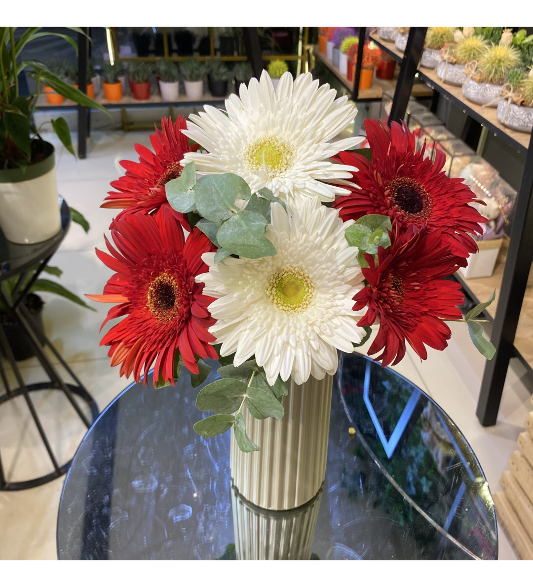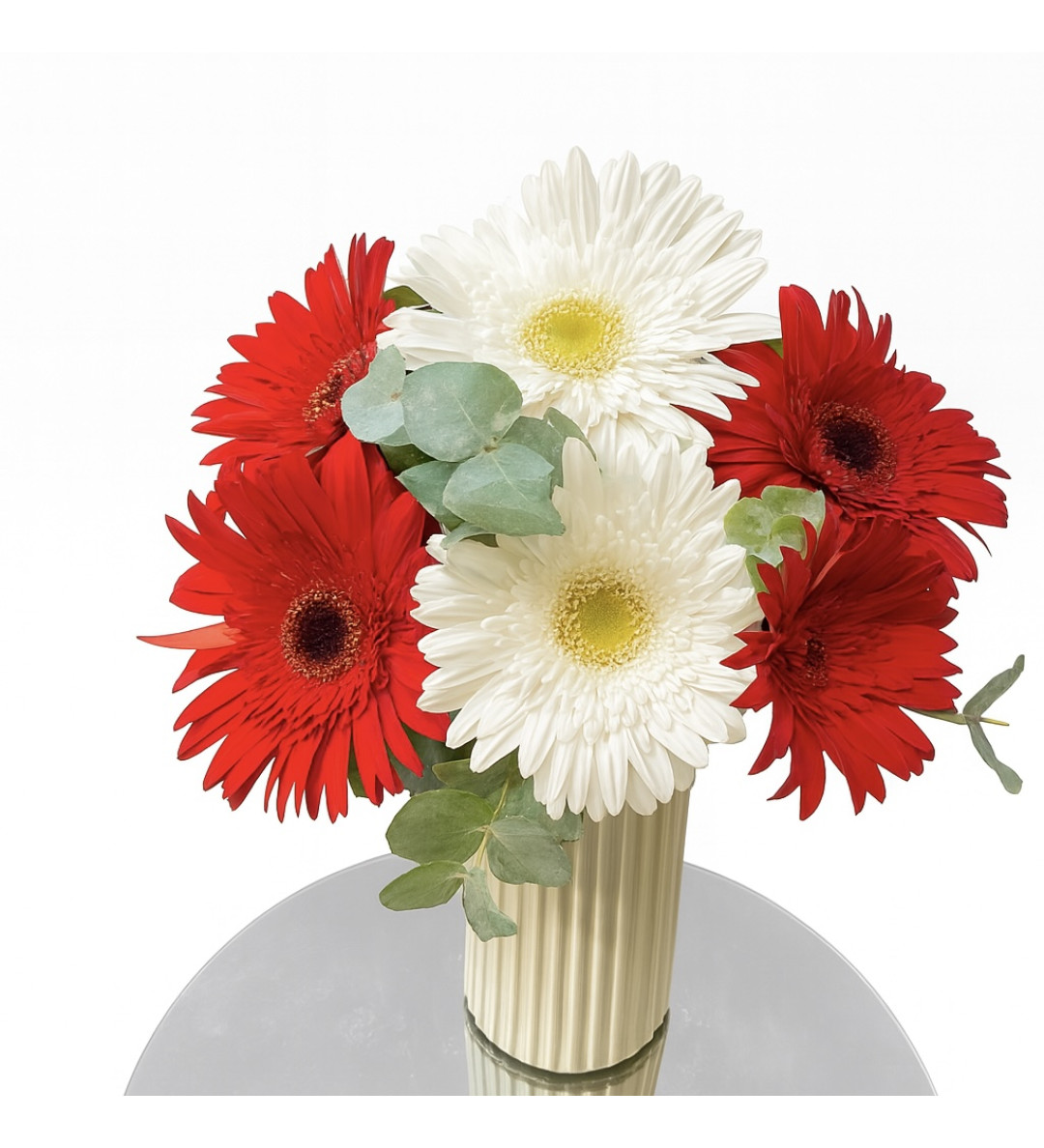 Canlı kırmızılar ve saf beyazların kusursuz uyumu… 4 kırmızı ve 2 beyaz gerberadan oluşan bu zarif aranjman, beyaz plastik dekoratif vazo içerisinde özenle hazırlanmıştır. Enerjik renkleriyle yaşam alanlarınıza neşe katar, sevdikleriniz için hem romantik hem de anlamlı bir hediye alternatifi sunar.